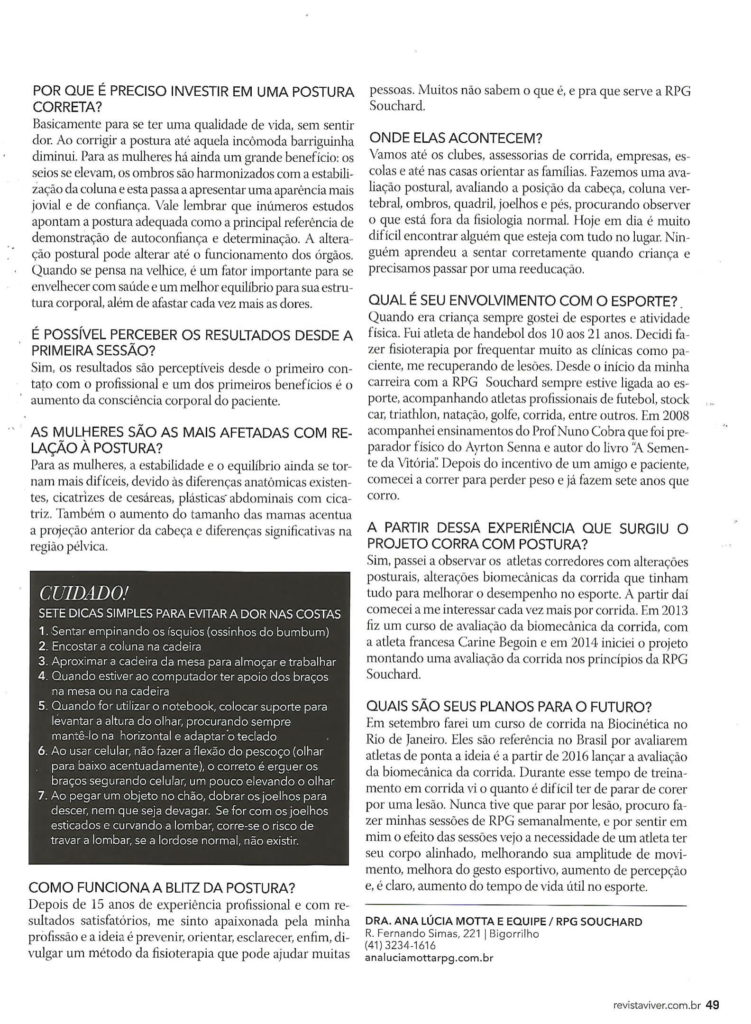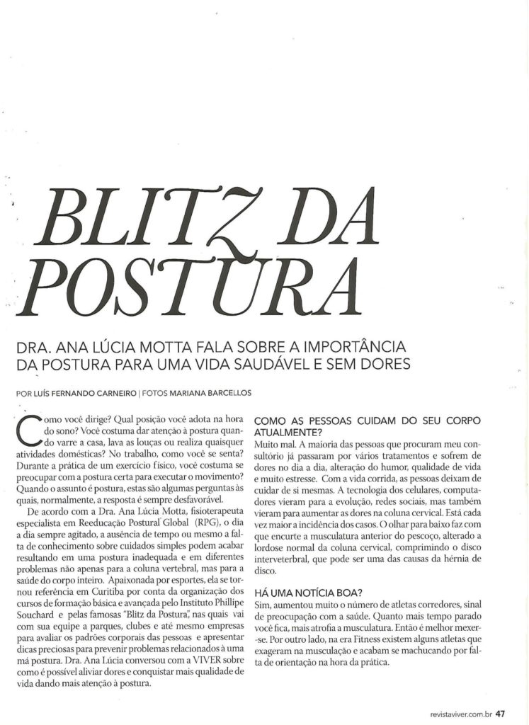 Você conhece a Blitz da Postura? Nesta reportagem a Dra. Ana Lúcia Motta explica o que é esse projeto e fala dos problemas causados pela má postura no dia a dia das pessoas. Reportagem veiculada agosto de 2015 na Revista Viver Curitiba.